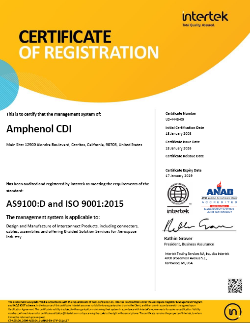 Based in Cerritos, California, AmphenolCDI is a proud member of the Amphenol Corporation family, continuing a legacy of excellence that dates back decades. Originally founded in Long Beach, California, CDI established itself as an industry leader in designing and manufacturing rugged RF connectors, RF cable assemblies, EMI Shielding Connectors, Commercial Aerospace Custom Connectors and Custom Overbraiding.